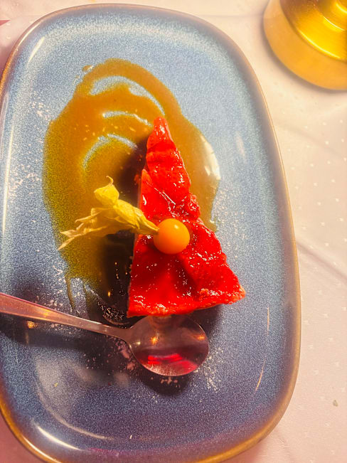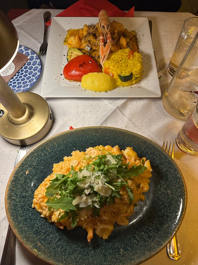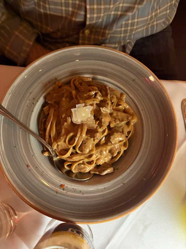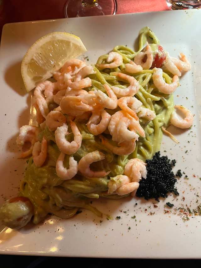 7.5/10The service was awesome! The server was very kind, patient, and helpful! They gave us very good suggestions about food and drink! They even brought a vas for the flowers that I had, which was very thoughtful! We ordered the 4 cheese pizza which was quite good 7/10. I had also ordered the carbonara pasta which was really good at about 9/10, it was very creamy and very filling. Loved the serving size! You can get very full by this meal. The dessert was very good! We took a creme brulle and white chocolate fruite sallad which was definitely a favourite! We had asked for a window seat in the description, and that was not followed through. We had also mentioned that it was a celebration, but nothing special was done for that. The tables were very very close together to the point that it was uncomfortable. We often make akward eye contact with the poeple next to us. It was really hard to get out of the seat once we were done. It was quite packed inside the restaurant!