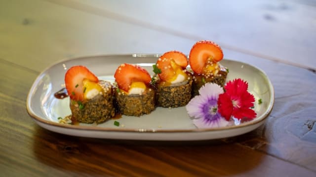 Criado no momento pelo chef, peixes variados, sashimi, nigiri, gunkan e maki