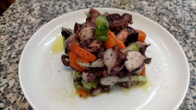 - Polpo, ceci, sale, aglio, pepe nero, olio evo, glassa di vino rosso
