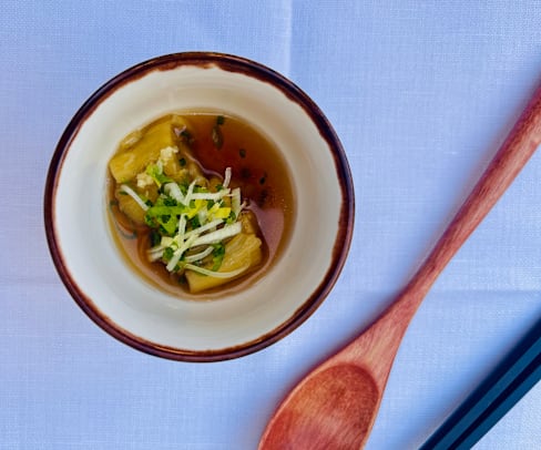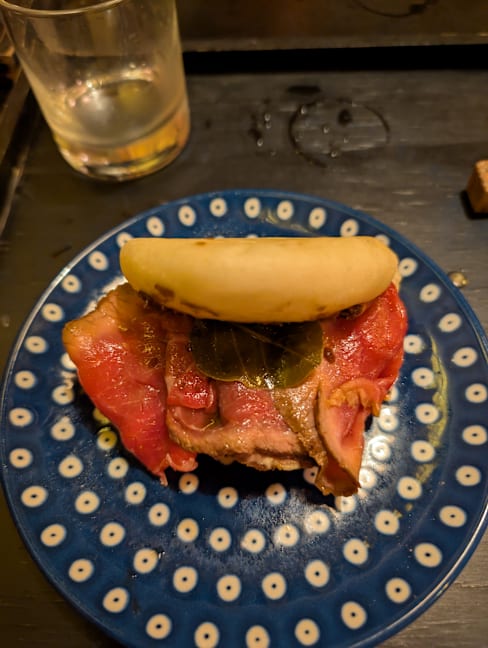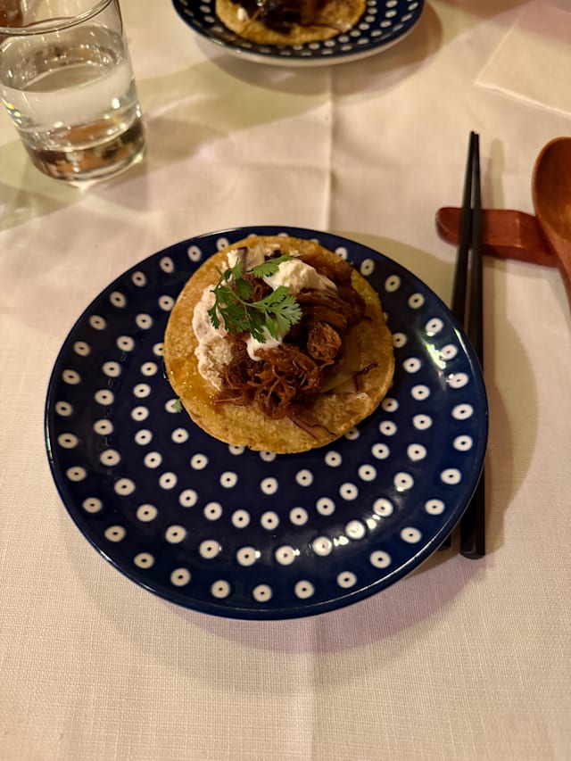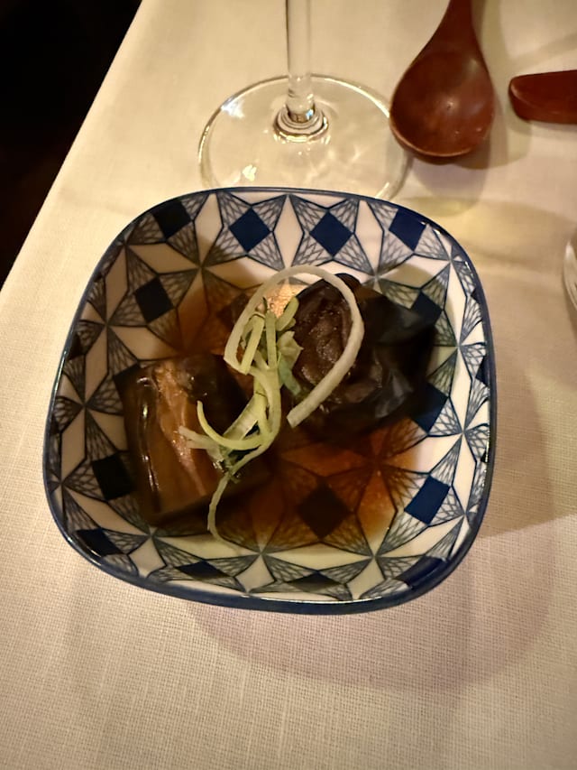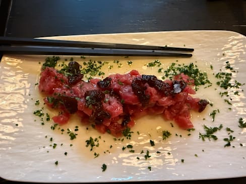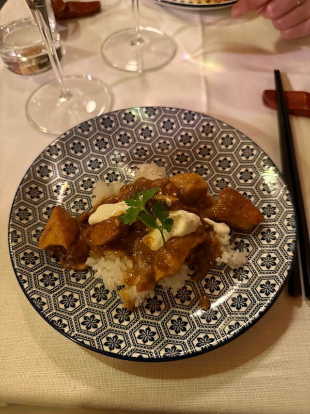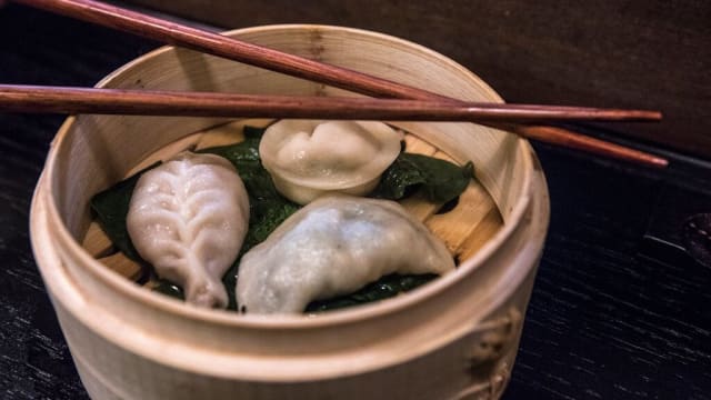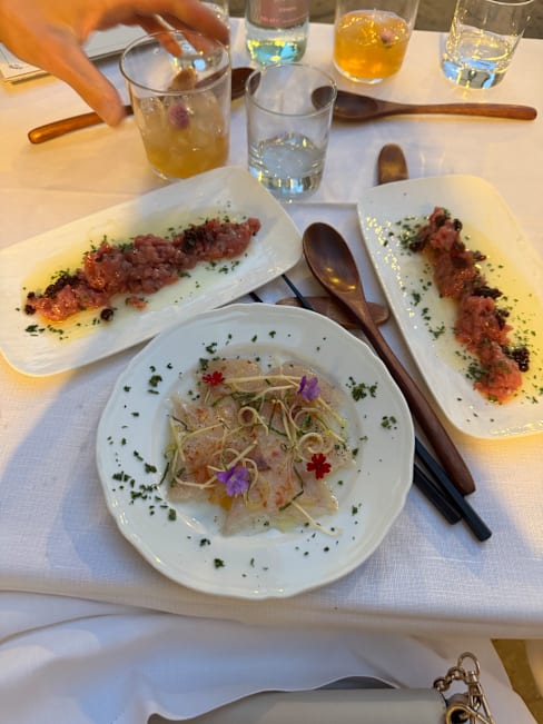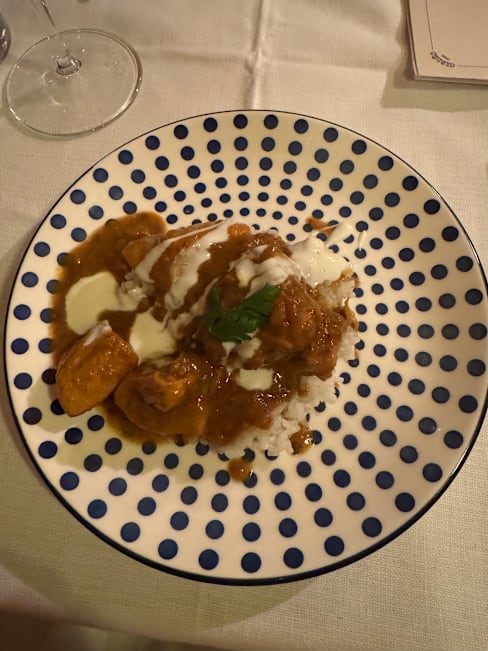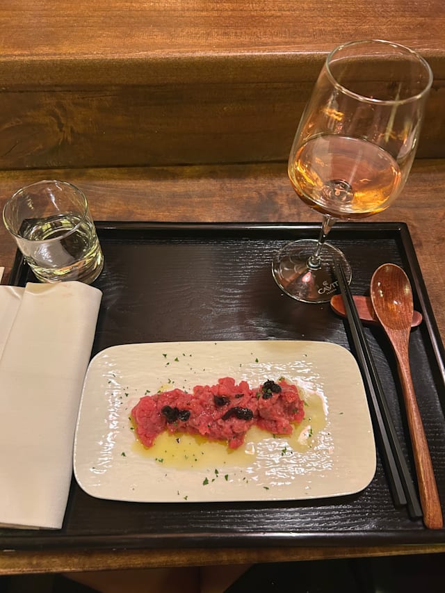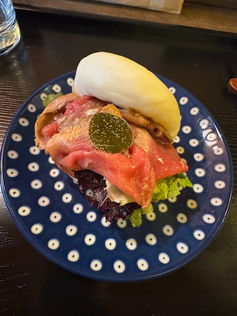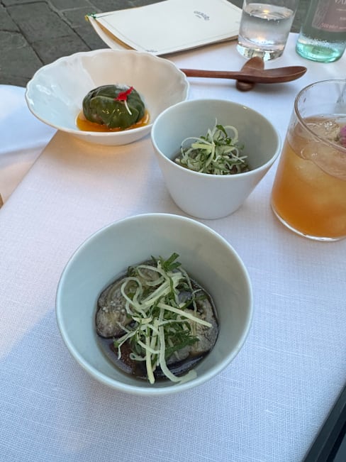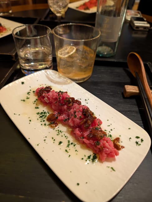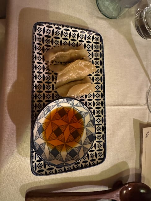 7/10+3Wonderful people and great concept, but I wish it was more unique and impactful with flavor. Great for folks who want to explore Japanese tastes in familiar Italian dishes, but if you're looking for something that is unique to both Japanese and Italian flavors like I was, this may not be the place for you. The chicken curry and taco were not something different enough to try in a different country. The beef tartare was good use of beef but definitely more simple, very heavy handed on the oil. My favorite dishes were the vegetable dishes: the eggplant and fish wrapped in greens. We ordered the additions of both the veggie gyoza, shrimp gyoza, and baozi with roast beef. The skins were very silk and well made but the filling was very salty and lacked any depth. The roast beef buns felt haphazardly thrown together, and was very soggy from the veggies. Their infused cocktails were wonderful, do get the Cibleo Panchi.