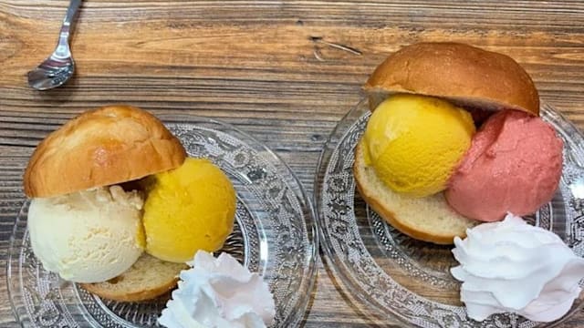 Brioche à la fleur d'oranger, garnie de panna da montare, pistache ou chocolat