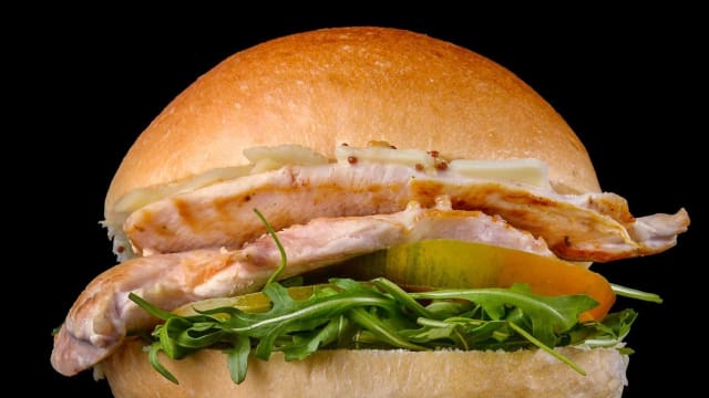 Bun artigianale, petto di pollo alla piastra, insalata, pomodoro, scaglie di grana e salsa senape e miele
