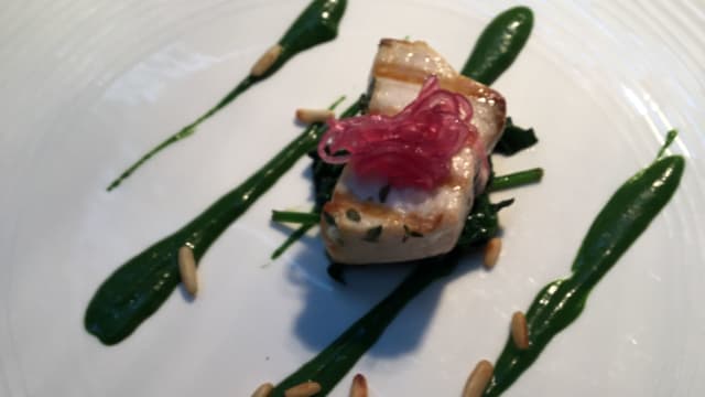 Baccalà in dolce cottura con crema di peperoni alla brace e olio alla cenere