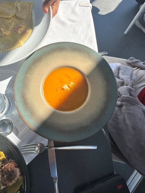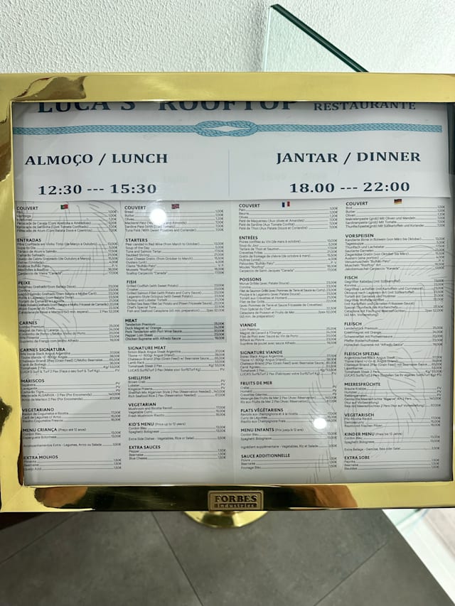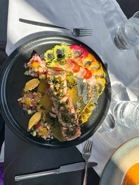 10/10We were greeted upon entry by the friendly staff. Our reservation was in place and took us to our table. The walk to the table is wide open vistas to the ocean. Stunning environment. Once seated at the table on the outdoor patio, all you could see was the gorgeous aqua, seawater, and natural cliff terrain. The service was extremely friendly and accommodating. There was a slight breeze and my wife was cool so they brought her a blanket to keep her warm. We were there for lunch and enjoyed impeccable platings for our meal. Gorgeous colors and nice layers of flavor. Without a doubt would go back. If you’re in other Algarve communities, it is worth the drive to experience this rooftop terrace, dining and service.