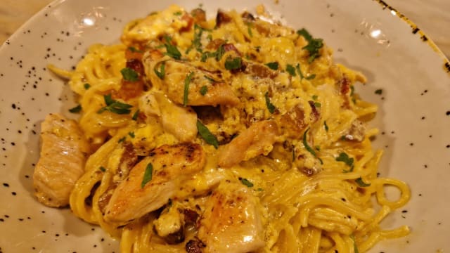 Esparguete servido com frango, guanciale, ovo batido, queijo parmesão e queijo pecorino