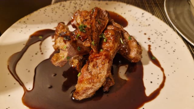 Pluma de porco preto servida com redução de vinagre balsâmico semi-doce