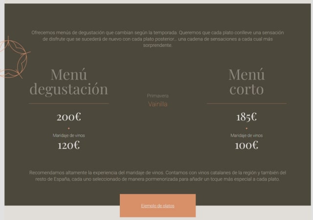 10/10This was very memorable dining experience that combined really creative Catalan food with exceptional wine pairings of local wines and friendly impeccable service . The wines included an aged cava that was as good or better than any vintage champagne and a reisling imitation that was worthy of the Mosel. The Catalan food was anchored in the chef's background in Spain and Canada and was of uniformly high creativity, appearance and above all taste.This was an exceptional meal that would be very hard to surpass.