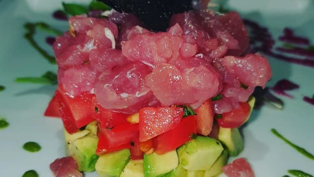 Bis di tartare, salmone ,mela verde , ,mandorle salate , salicornia e tonno alla catalana