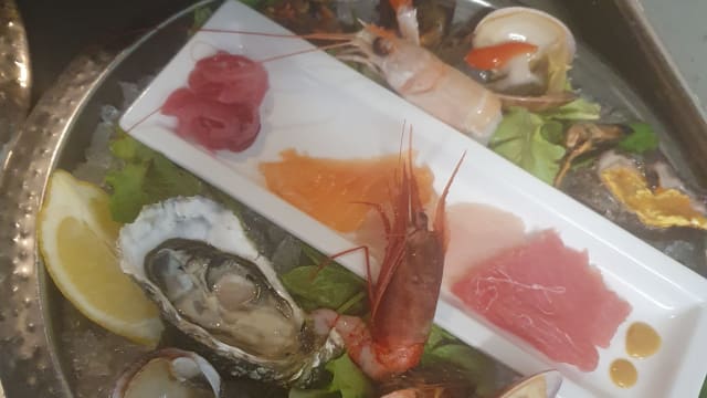 carpaccio, ostrica, gambero rosso di Mazara, scampo Sicilia e frutti di mare