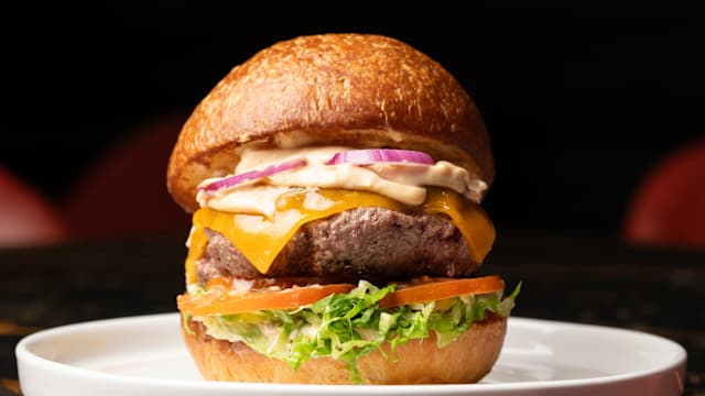 Brioche bun, hamburger di scottona bavarese, cipolla, lattuga, pomodoro, cheddar e mayo