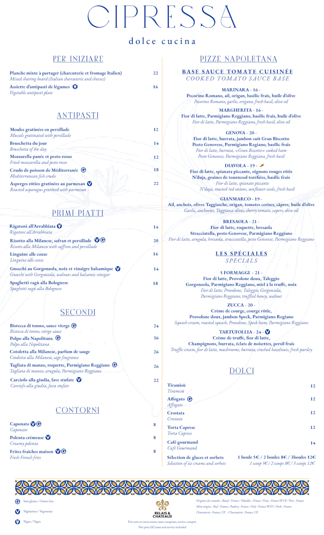 Cipressa is identified as offering italian cuisine.
