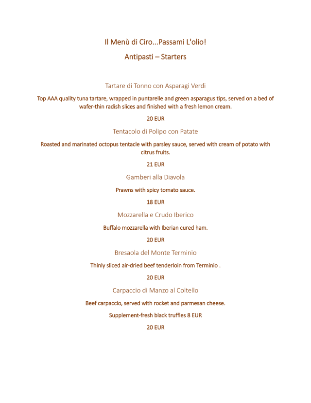 10/10Always a treat to be hosted and served the delicious and authentic food at Ciro's. Everything is fresh and tasty, a special mentioning definitely deserves the fantastic Vitello Tonnato I had as primo, followed by the as great tasting King Prawns. :-)