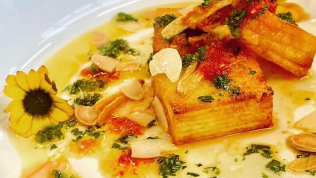 Eggplants, chickpeas, tomato coulis, yogurt, bread croutons and pine nuts