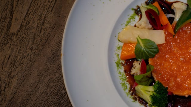 Salmone norvegese in taglio fine, marinato alla rapa rossa, verdure ghiaccio e olio al timo