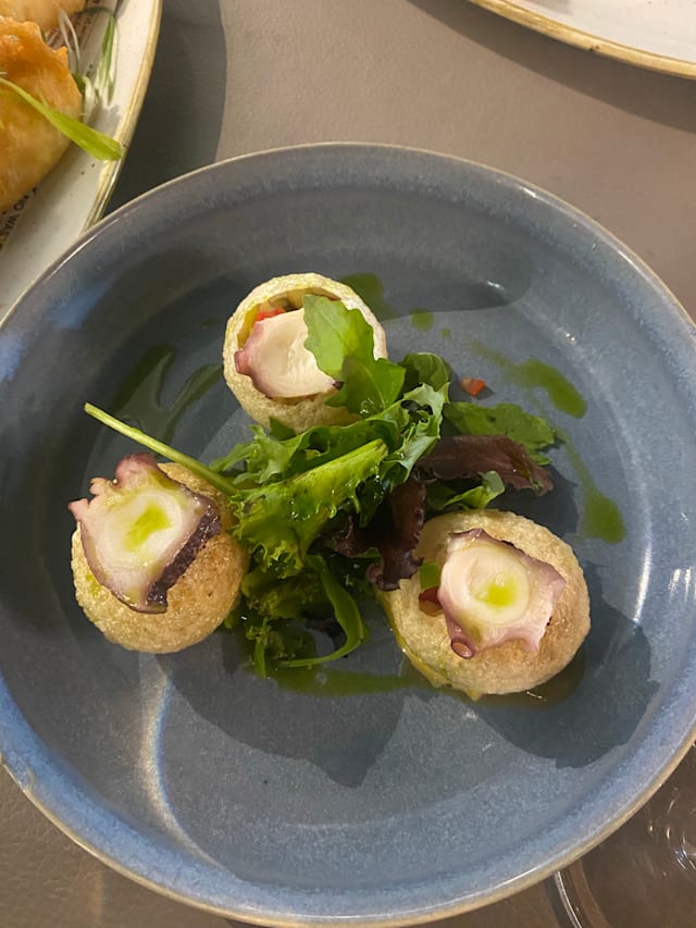 Bolinhos crocantes de polvo, picadinho de tomate e emulsão de alho confit (3 und)