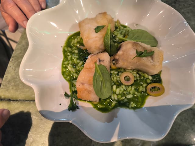 Medalhões de tamboril em azeite e alho acompanhados com arroz cremoso de limão e espinafre