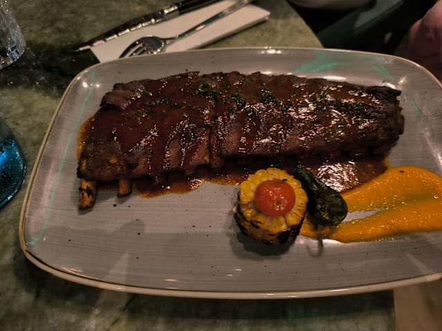 Bochechas de porco ibérico glaceado com molho de cabernet sauvignon, puré de batata doce e suas guarnições