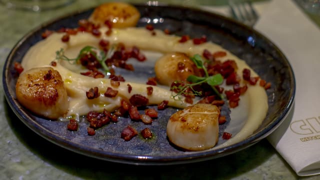 Scallops de foie gras, presunto pata negra ( ibérico) e pêra