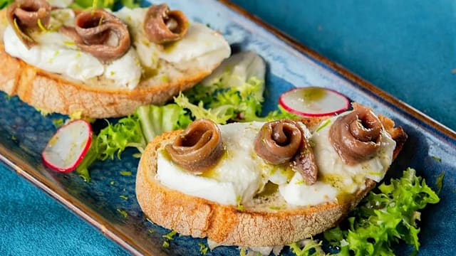 Bruschetta con mozzarella di bufala, acciughe di Porticello, olio al basilico e scorza di limone verdello