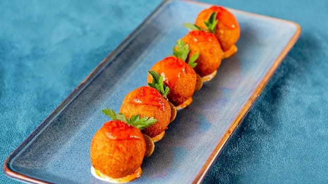 Polpette di pesce spada* con polvere di pomodoro secco, salsa di pomodorino arrosto e mayo al lime e menta