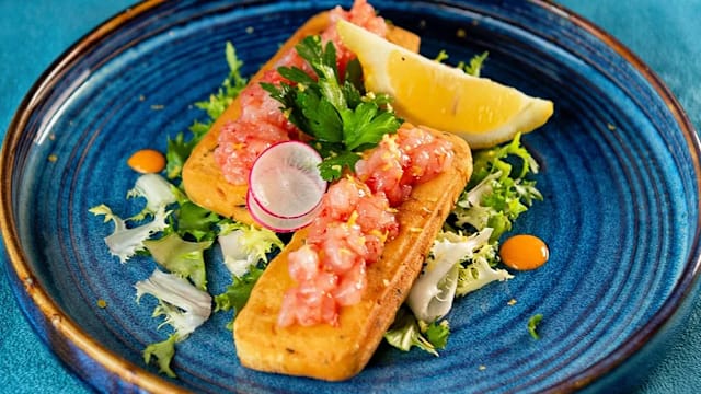 Panelle siciliane, tartare di gambero rosso di Mazara* e zest di lime