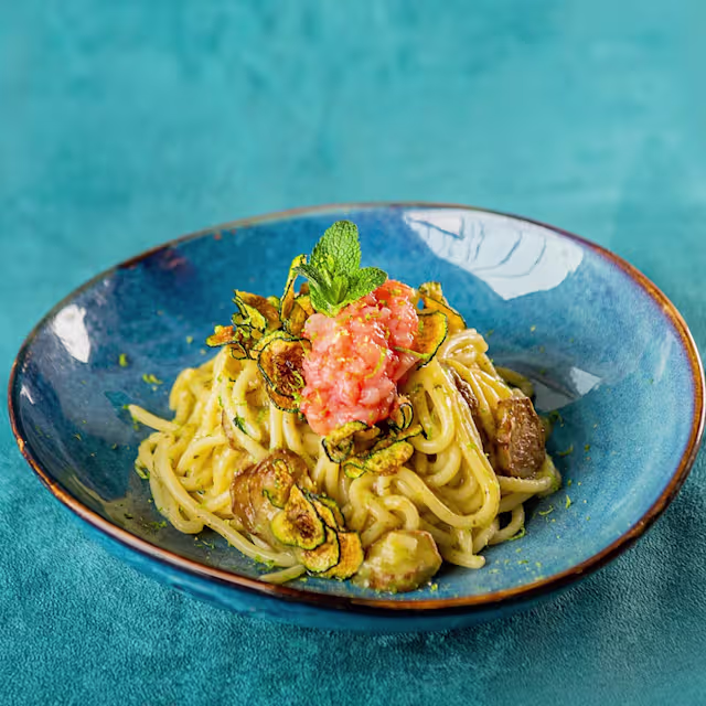 - Spaghetti with fried zucchini, Mazara red prawn tartare and lime zest