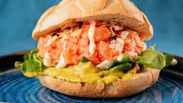 - 5-cereal bun with sea bream burger with butter and lemon, crispy black pork guanciale, grilled primosale, fresh spinach, orange honey and Sicilian citrus mayo