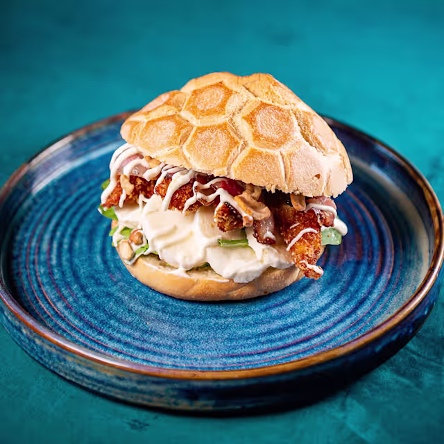 - Burger di pollo, pesto di pistacchio, insalata, pomodoro a fette, bacon croccante e mayo