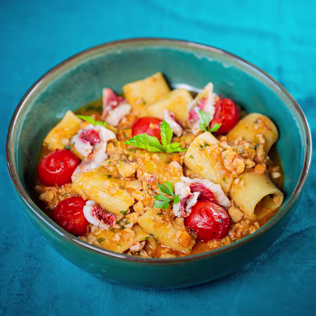 - Paccheri rigati con scorfano, pomodoro ciliegino, mandorle tostate e menta fresca