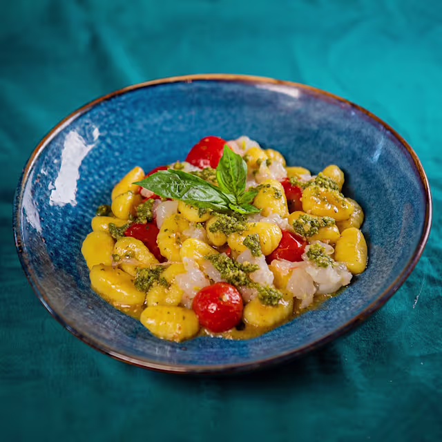 - Gnocchi di patate con tartare di scampi, pomodorino confit e gocce di pesto di basilico