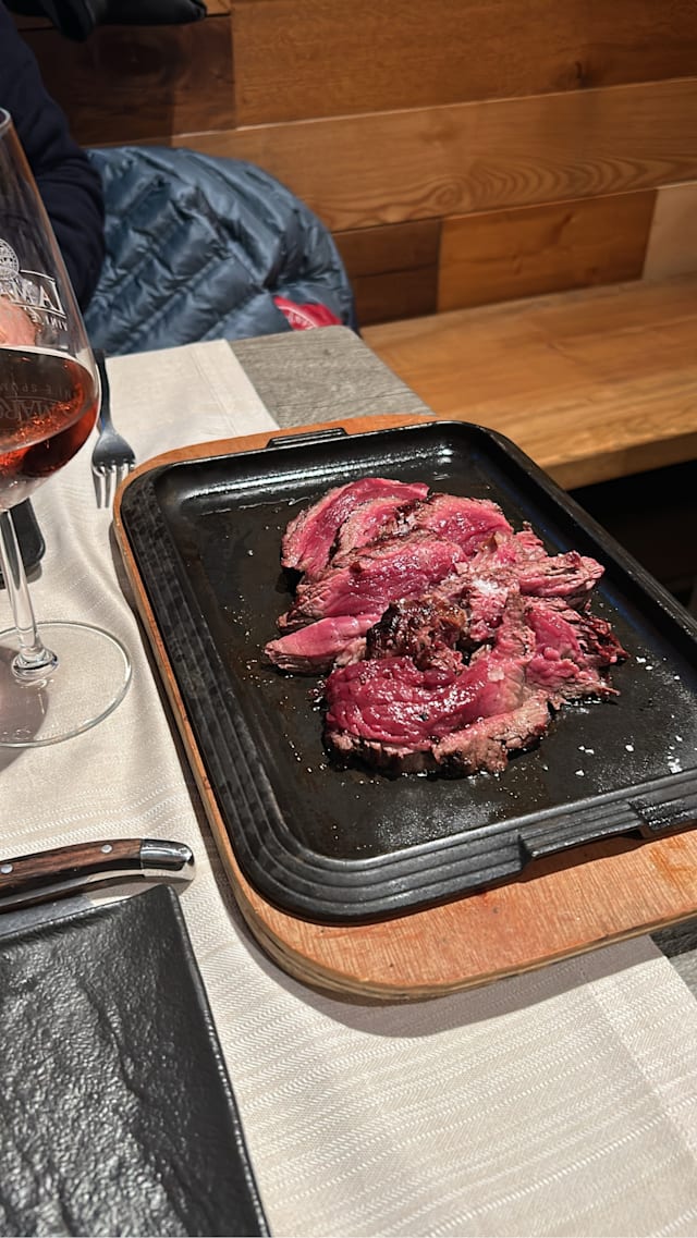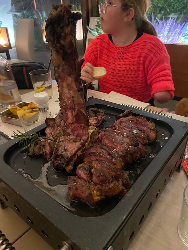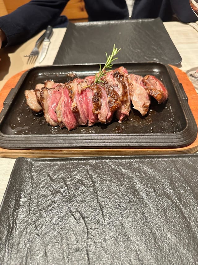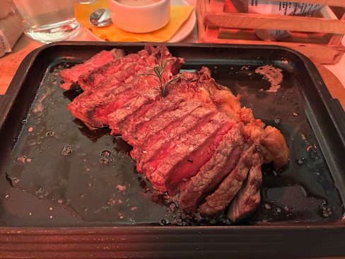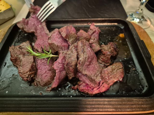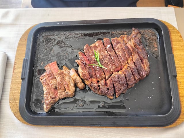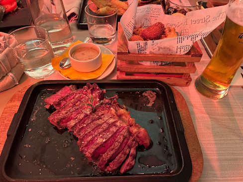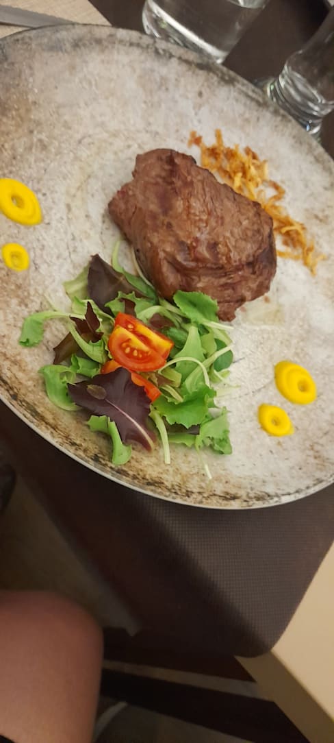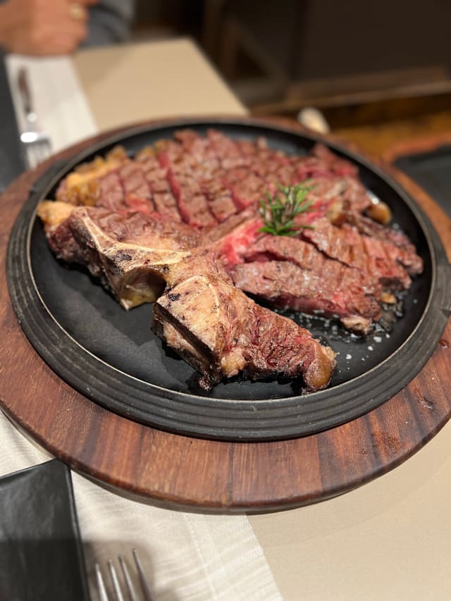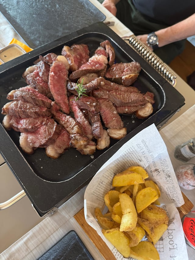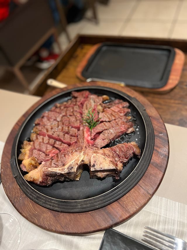 5/10We made a mistake on the reservation and came a day early. They were gracious to seat us. And asked us still or sparkling water. We told them still. It took 3 reminders after that before we got the water. The patio was busy but hardly anyone inside until later. We told them we would like to enjoy our drink before placing an order. They were fine with that and checked a couple of times to see if we were ready. That was good. There was a young man who spoke English and helped us understand the cuts of meat. That was good. The Buratta appetizer was exceptional. And a large enough portion to share. When we finished they brought a Ribeye, also called Strip Steak. We chose the more expensive of the 3 choices which was the Italian meat. It was chewy and not as flavorful as expected based on the menu and waiter’s description. Didn’t finish it. Was very late in our meal before anyone checked on us. We told them and they took the meat off the bill. Should have had a cheeseburger. Not good