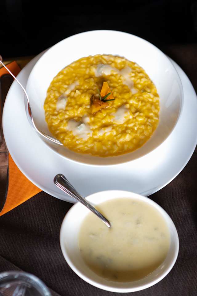 - Lasagne d’autunno (sfoglia di pasta fresca, zucca, cipolla, rosmarino, latte, amido di mais senza glutine, burro, noce moscata, speck) strati di pasta fresca con crema di zucca e speck croccante. / risotto goloso (riso, crema di radicchio, cipolle, sedano, carote, vino bianco, taleggio, noci) risotto cremoso con radicchio e taleggio