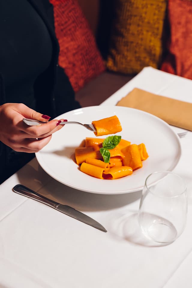 Paccheri rigati ai tre pomodori mantecati, burro, parmigiano e basilico.