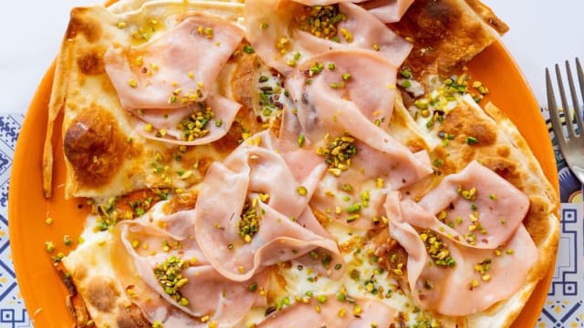 In crosta di pistacchio, stracciatella di burrata, crostoni di foc ac cia e pomodorini freschi