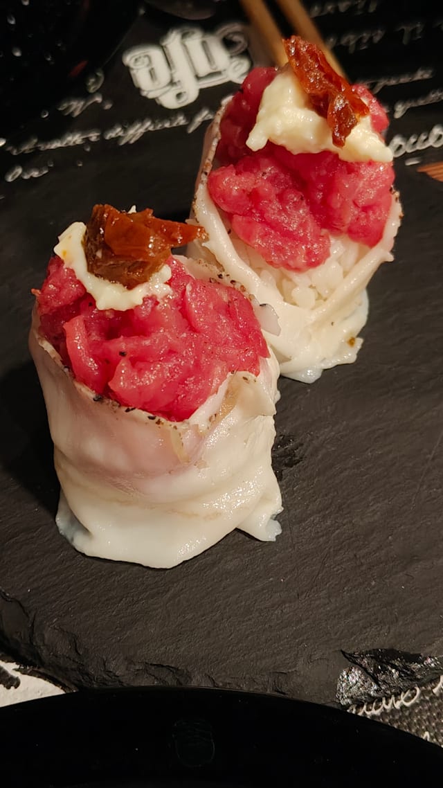 2 pz nigiri altimbocca, 6 pz hosomaki con tartare di wagyulem, 6 pz roll romano e sashimi di wagyulem