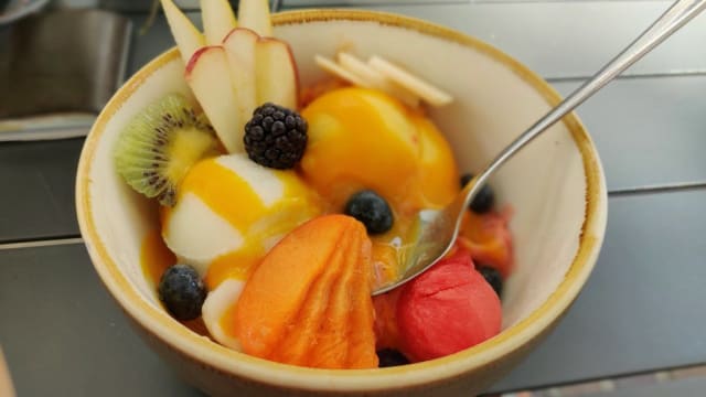 Brioche mit einer kugel super duper schoki gekrosst, dazu kommt banane, schokosauce, karamellsauce & früchte