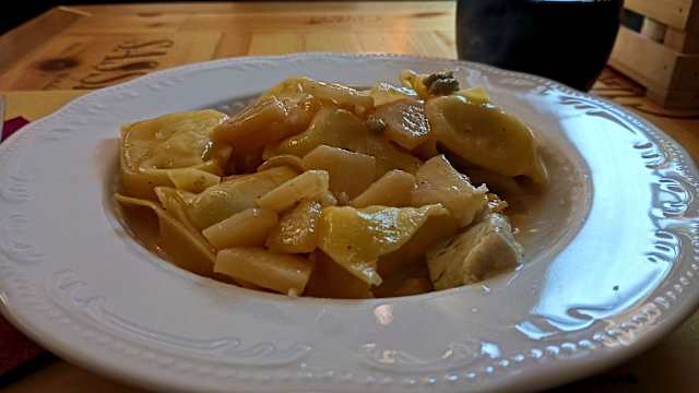 - Tortelli di zucca con crema di parmigiano, salsiccia e noci