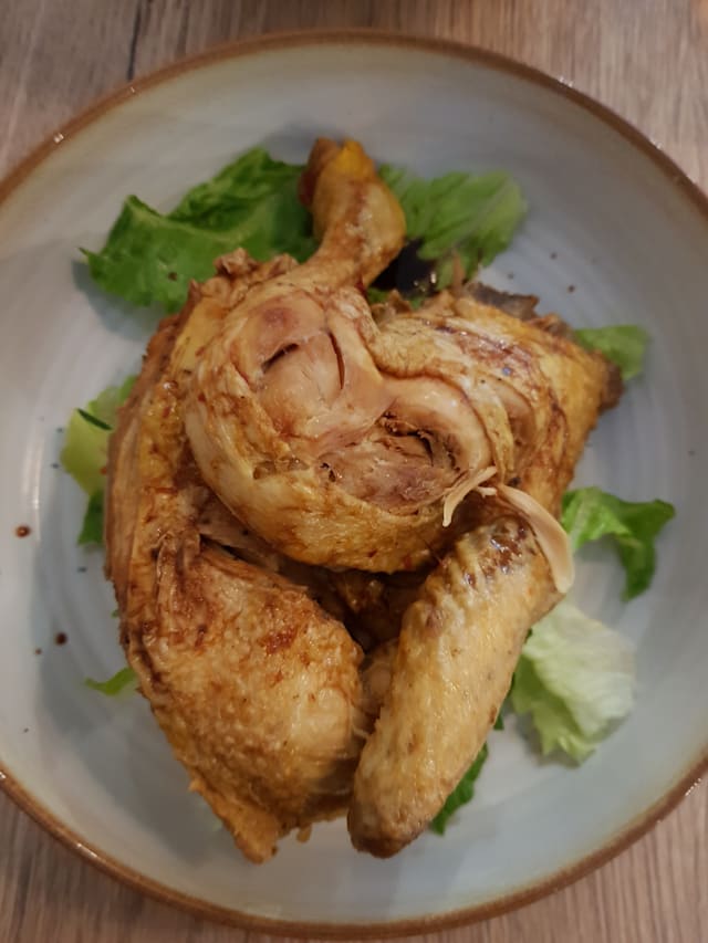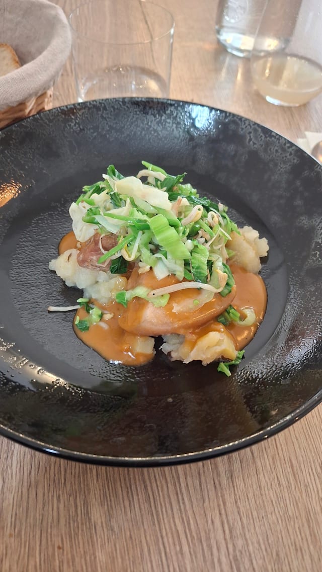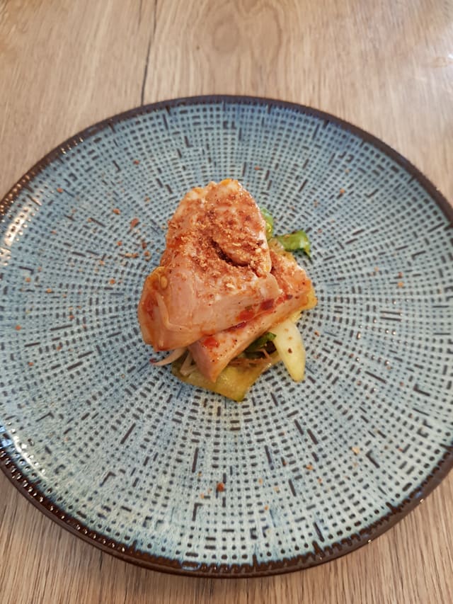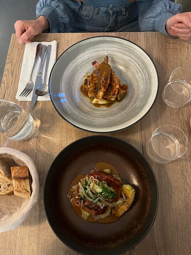 8/10Interesting mix of Asian and French food. We ordered 2 dishes, grilled shrimps and pork, which were both tasty. The waiter was very kind and always pleasant. The only negative side was that the room was a bit chill and so the table.
