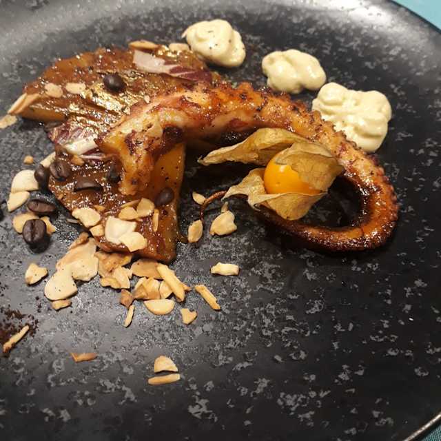 - Polpo saltato in padella con mele, crema al curry, e chicci di melograna