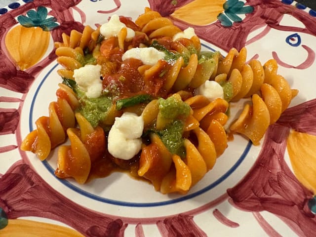 Fusillone pasta with cherry tomatoes, provolone and basil pesto
