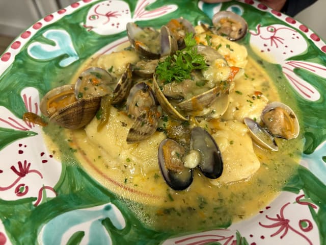 Gnocco pasta stuffed with provola and lemon with clams