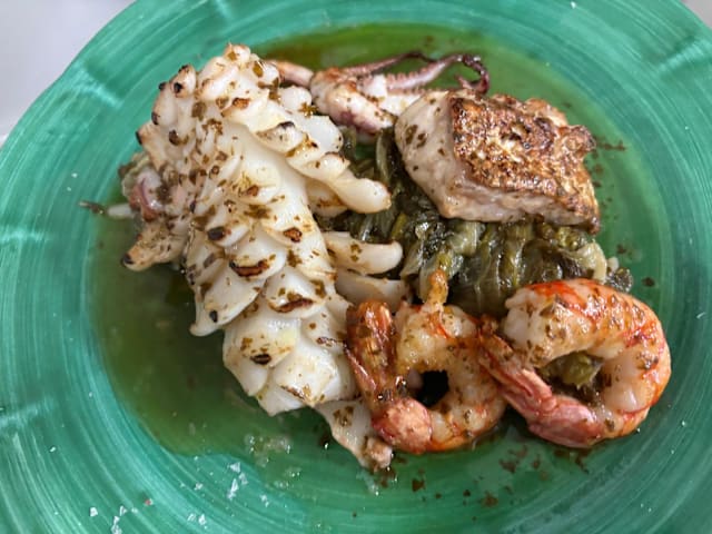 Grilled mediterranean fish selection with escarole and mint sauce