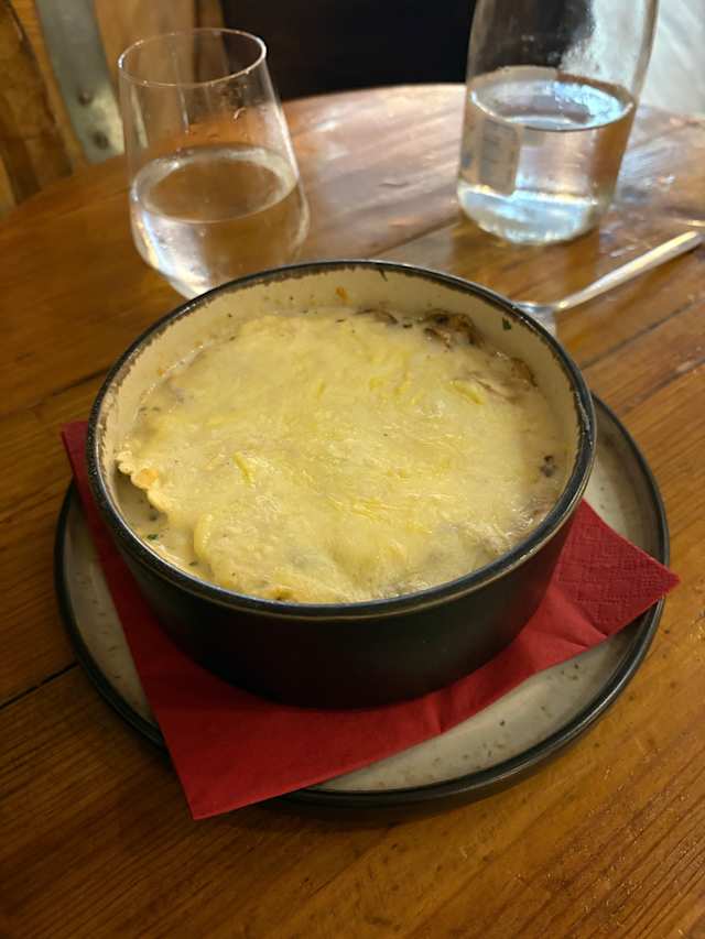 - Raviolis frescos de cogumelos, gratinados com queijo emmental