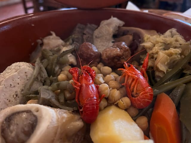 Garbanzos de Fuentasúco, col, cardillos, judías verdes, nabos, patatas y cangrejos de río. Morcillo, jamón, chorizo, tocino entreverado, gallina, cuello de ganso y hueso de taba.