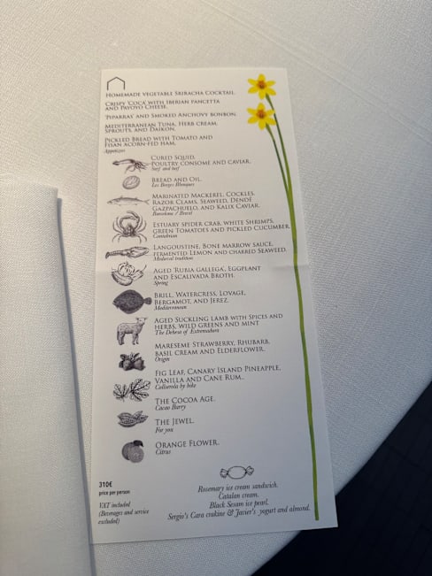 10/10+3Cocina Hermanos Torres was phenomenal. From the moment they opened the door to greet us the service was impeccable. We were seated quickly and immediately offered champagne. Everything is beautiful and perfectly placed. You can tell every detail is considered from the flowers on the table to the menu you’re presented with. There were 16 courses, paced perfectly and each one more delicious than the last. I can’t even begin to describe how unique each course was and they were all put together so wonderfully. Fresh, local ingredients. The open kitchen was so exciting to watch. I loved every minute of our dinner here and it was truly an experience. I would highly recommend for a special occasion and celebration. We will definitely be back!