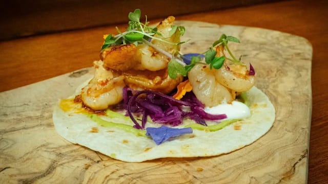 Base de guacamole, lombarda encurtida, nata, salsa spicy, salteado de calabaza y berenjena con salsa detamarindo.