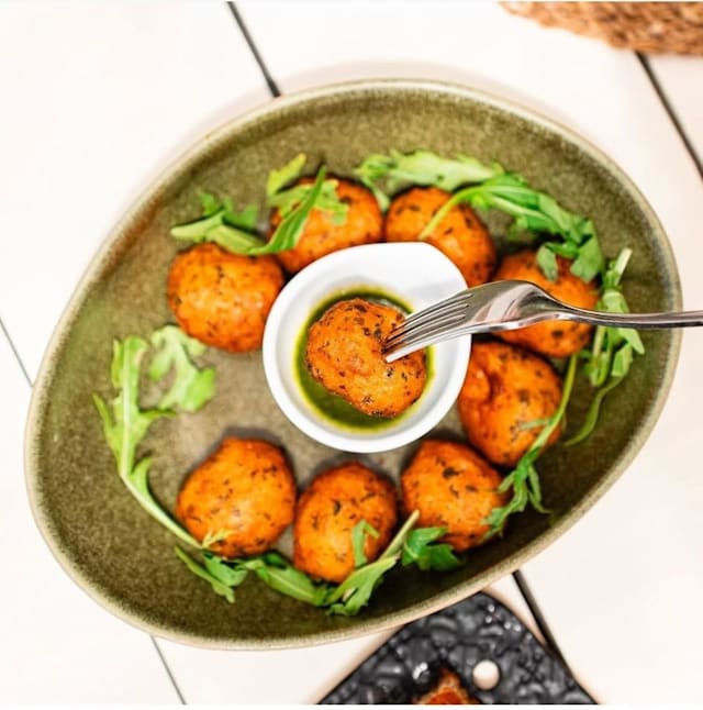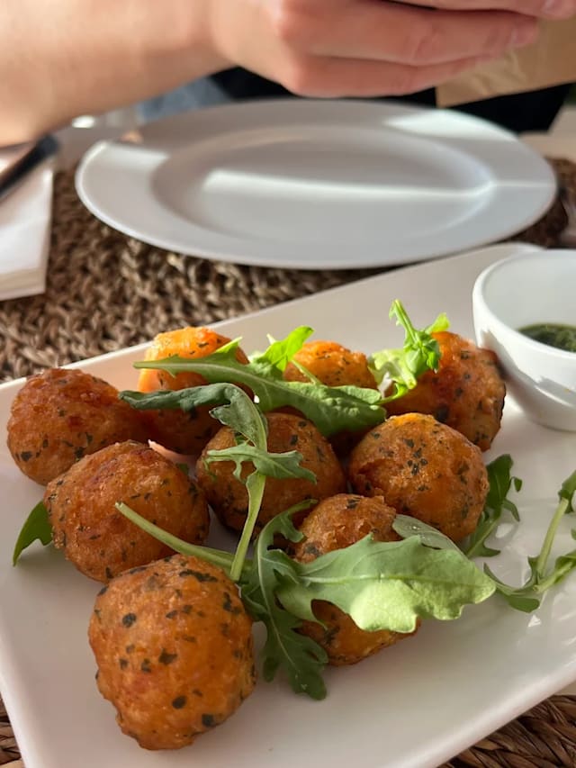 Croquetes de espinafre com pinhão, servidos com aioli vegano da casa e finalizados com lascas de amêndoas torradas.