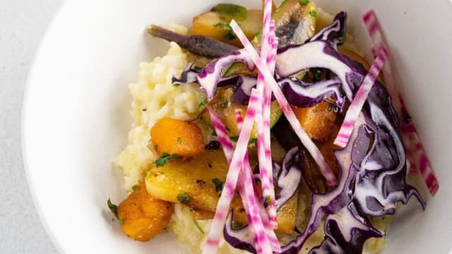 Ecrasé de pommes de terre, caponata et crème d’ail noir