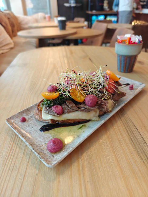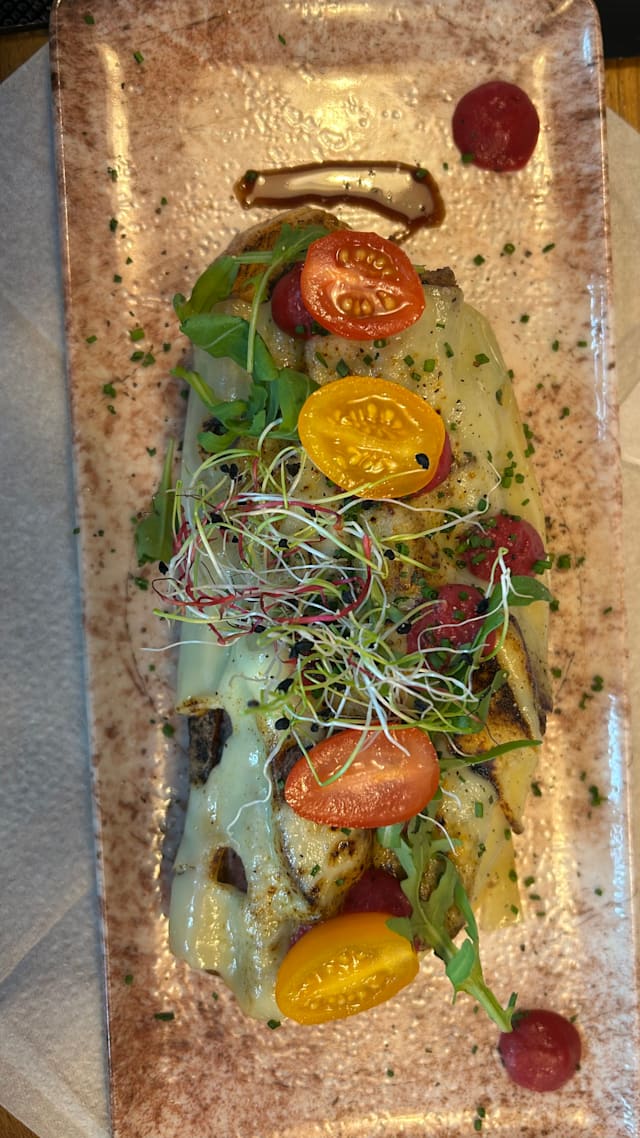 (Pain noir à l’encre de seiche, gruyère, bœuf cuit 7h, effiloché, guacamole d’avocat, légumes grillés) accompagné de potatoes maison