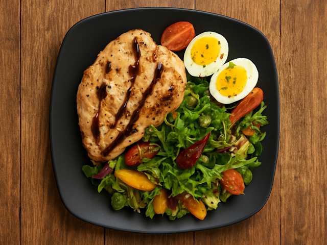 - Salade verte, tomate, concombre, pomme, noix et toasts de fromage de chèvre chaud et miel